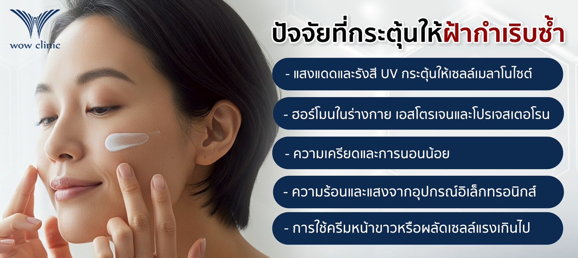 - ปัจจัยกระตุ้นฝ้า เช่น แสงแดด ฮอร์โมน ความร้อนจากสิ่งแวดล้อม ความเครียด และการพักผ่อนไม่เพียงพอ