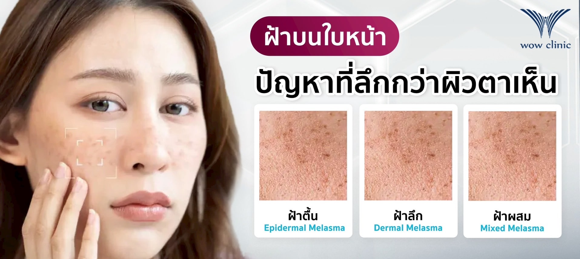 - ฝ้าลึก (Dermal Melasma) เม็ดสีฝ้าฝังตัวในชั้นหนังแท้ (Dermis) ทำให้มีสีเทาเข้มหรืออมฟ้า รักษายากกว่าเพราะตัวยาไม่สามารถเข้าถึงชั้นผิวลึกได้ง่าย การรักษามักต้องใช้เลเซอร์เฉพาะที่ปรับพลังงานต่ำ และต้องทำซ้ำหลายครั้ง